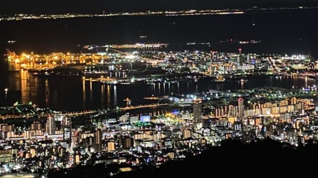 近くに大きなビルが複数ありますが、海辺で倉庫の明かりのみですので夜空をバックにイルミネーションがキラキラと輝いています。